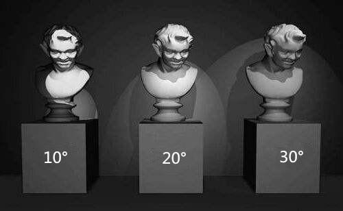 30°角的燈杯照射范圍大,但其中心光強最小,在照射面上形成的光斑讓雕像變的更加的柔和。但由于光束角過大,把背景墻和雕像混在一起了,這樣在10°和20°光束角照射的雕像放在一起時,就很難引起人的注意。