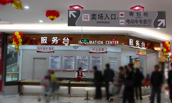 服務臺是給顧客提供貼心服務的地方,例如開發票、寄存等等??梢圆捎胠ed筒燈照明,達到較高的亮度,以滿足服務臺書寫亮度要求,通常大型商場服務臺背景墻裝飾體現商場企業定位與文化,應采用導軌射燈或洗墻燈加以重點照明,使其突出。
