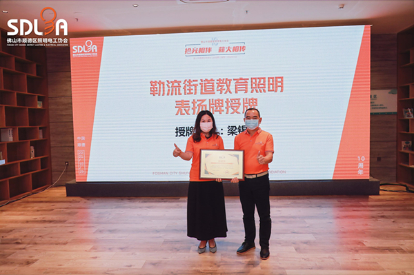 大會上,對于華輝教育照明熱心勒流教育事業,樂善好施,順德區照明電工協會會長梁錫強先生頒發感謝狀牌匾,華輝教育照明總經理戴姣華女士上臺領牌匾。