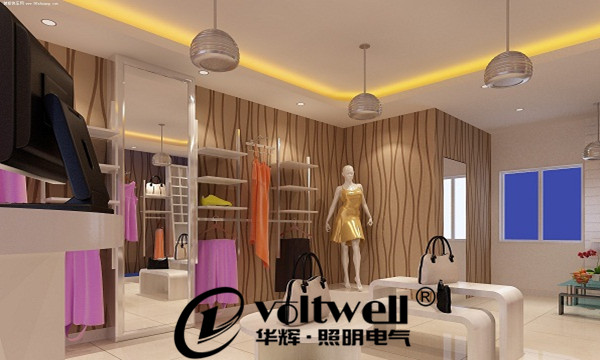 服裝店的一般照明,即為基本照明。對服裝店空間形象而言,對整個室內光環境氣氛都具有相當大的影響力。服裝店有水平照度,一般照明照度不宜過高,否則,帶來很大的資源的浪費。基本照明對整個空間即為應有均勻的照度水平,盡量減少明暗差別,特別是盡量減少暗區。基本照明一般不具有方向性,但是在店內商品位置改變時,不需要變更燈具位置,也能保證整個空間的基本照明水平,具有靈活性大、適應性強等特點,受外界條件和技術條件限制無法安裝重點照明的空間也要使用基本照明。