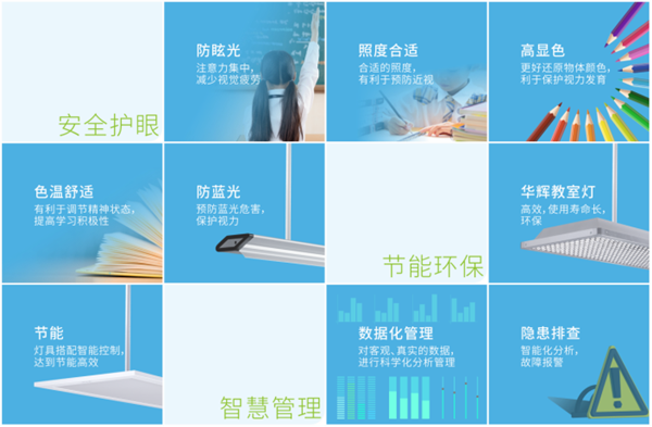 據統計,每個學生大約有60%的時間是在教室度過的。相關研究發現,過度使用電子產品、不良的教室照明環境,是導致學生視力下降的主要原因。我國有些學校的教室照明仍采用熒光燈,熒光燈的衰竭速度快、照度偏低,長期在這樣的燈光下上課,容易加大用眼負擔,誘發近視。