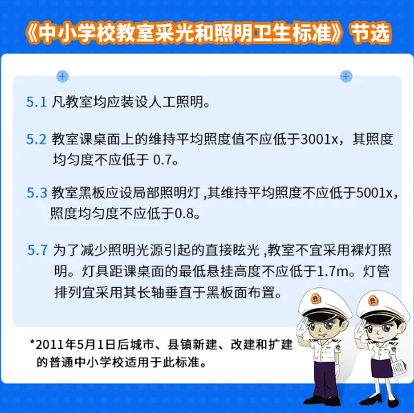 2018年,教育部、國(guó)家衛(wèi)生健康委等8部門聯(lián)合印發(fā)《綜合防控兒童青少年近視實(shí)施方案》,明確提出:要為學(xué)生提供符合用眼衛(wèi)生要求的學(xué)習(xí)環(huán)境,嚴(yán)格按照普通中小學(xué)校、中等職業(yè)學(xué)校建設(shè)標(biāo)準(zhǔn),落實(shí)教師、宿舍、圖書(shū)館(閱覽室)等采光和照明要求,使用利于視力健康的照明設(shè)備,學(xué)校教室照明衛(wèi)生標(biāo)準(zhǔn)達(dá)標(biāo)率100%。同時(shí)《中小學(xué)校采光和照明衛(wèi)生標(biāo)準(zhǔn)》也做出了相關(guān)規(guī)定。