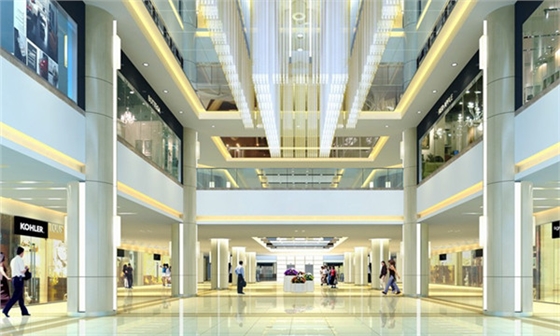 中庭是商場的緩沖區域和公眾活動空間,并增加商場的開闊感,調節空氣質量,提升整個商場的空間質量和層次。因此中庭照明設計應具有一定的藝術性,裝飾空間并營造舒適的環境。中庭建設一般都有自然采光的設計,但是夜間營業必須依靠人工照明。空間高大的中庭頂部宜采用led筒燈照明,為改善頂部照明的不足,墻壁也可以設置壁燈照明,同時也可以豐富空間的層次。